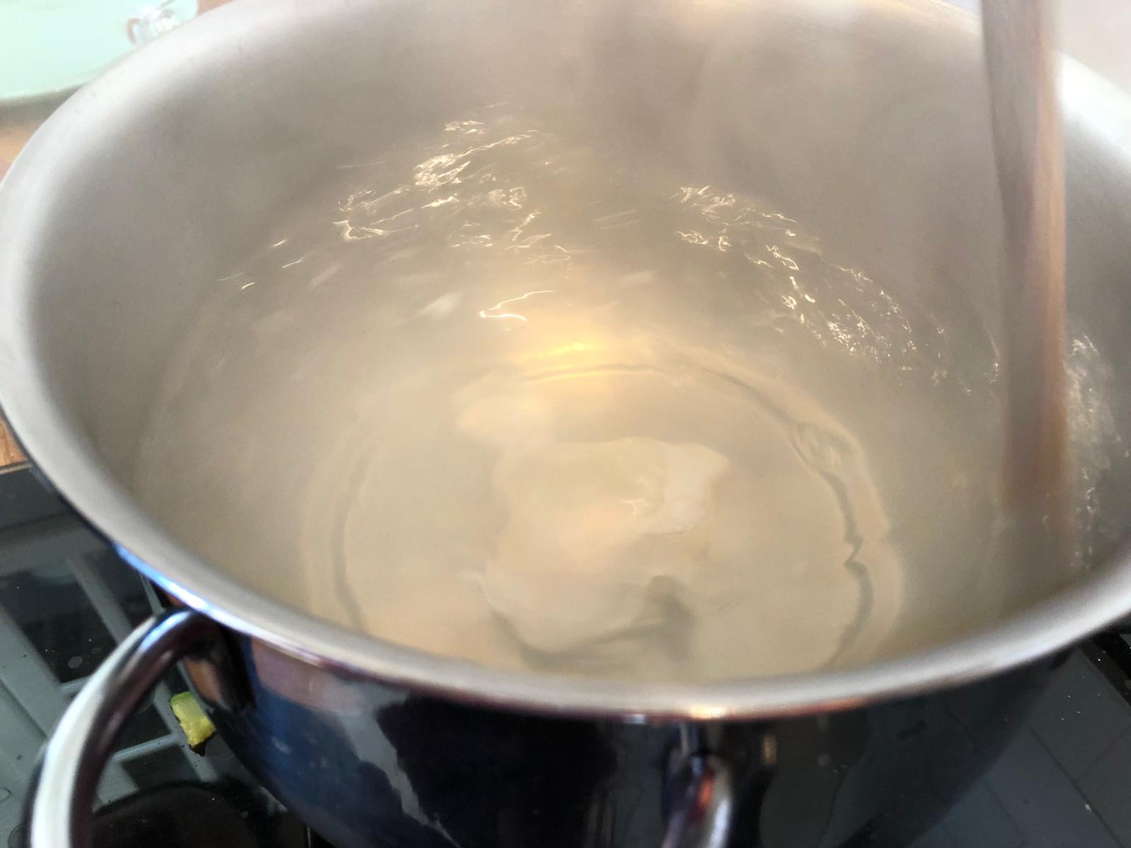 - Iniziare a portare l’acqua alla temperatura necessaria, approssimativamente prima del bollore (deve sobbollire appena)