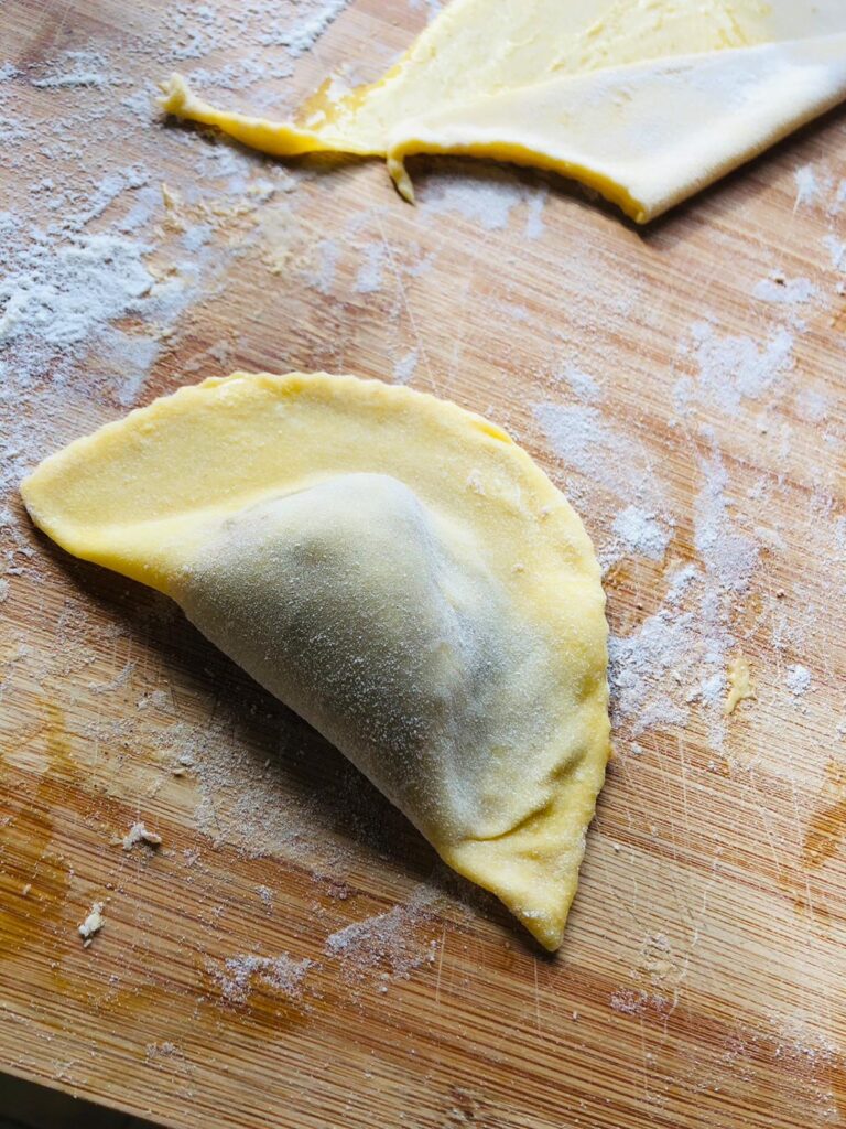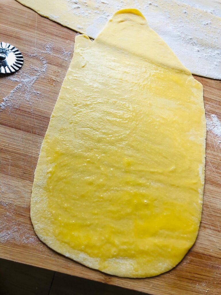 - Stendere la pasta sfoglia dolce e fare i ravioli apponendo la ricotta al centro delle sfoglie, che avremo precedentemente spennellato con un uovo sbattuto, e richiudiamo tagliano con una rotella.