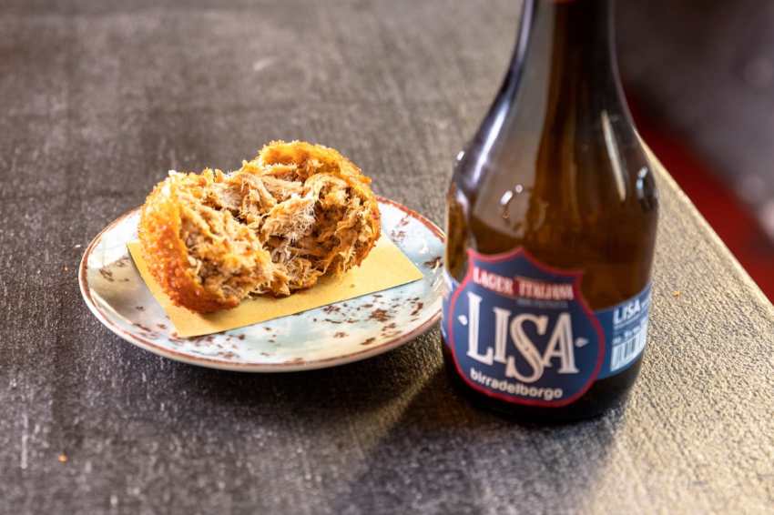 Sfera di pulled pork – Osteria Birra del Borgo: Il maiale sfilacciato è quella cosa che rende sfiziosa ogni ricetta lo contenga. Se poi è fritto, siamo a cavallo. L’idea di friggere il pulled pork e realizzarci una sfera è venuta a Luca Pezzetta diOsteria Birra del Borgo, il locale di Prati dove gustare fritti, pizza, burger e cucina da accompagnare alla selezione di birre. La sfera di pulled pork è ottenuta da una spalla di maiale marinata nella birra per circa 24 ore, viene poi cotta a bassa temperatura per circa 6 ore con senape, paprika, finocchietto, birra, sale, zucchero e pepe. A fine cottura vienesfilacciata e mantecata con il liquido di cottura, poi impallinata e panata con doppia panatura di panko e corn flakes. È servita accompagnata dalle birre Lisa oppure dalla Reale Extra.
